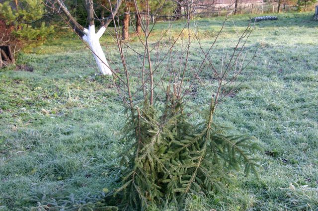 - Сами деревья, особенно молодые, нужно тщательно обмотать лапником (с колючками вниз). Сверху нужно зафиксировать лапник верёвками. Такое укрытие должно быть примерно на 1 м от земли. Опытные садоводы умудряются в такое укрытие положить какое-нибудь сильно пахнущее вещество для отпугивания грызунов (нафталин, креолин, бузина, мятное масло).