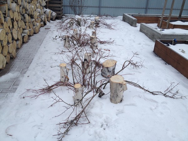 Обязательно нужно привязывать саженцы к колышкам, так как в Сибири часто бывают сильные ветры. Опытные садоводы окружают саженец небольшой изгородью из колышков, чтобы сдержать порывы ветра. После укрытия ствола саженца, корневая шейка утепляется навозом, а сверху засыпается земляной холмик высотой до 30 см. Перегнивая, навоз обеспечит питание корней минералами, создавая благоприятные условия для дальнейшего развития деревца. Поверх земляного холмика присыпается толстым слоем снег. Подобное укрытие позволит молодому саженцу перенести суровые морозы и весной быстро пойти в рост.