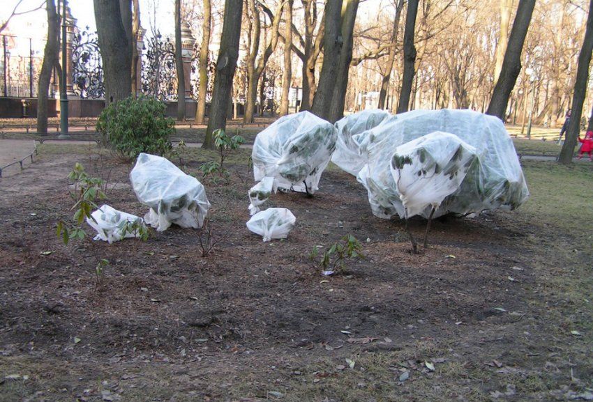 Укрывать нетканкой надо постепенно – в конце октября одним слоем, через пару недель, в начале ноября, – вторым, а если есть необходимость, то третьим.