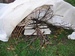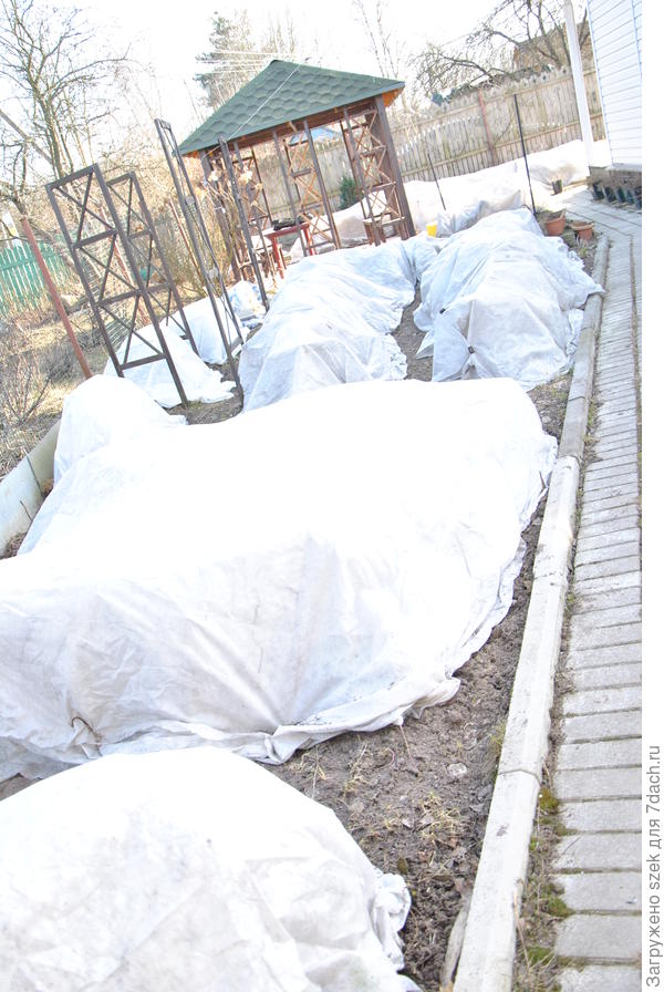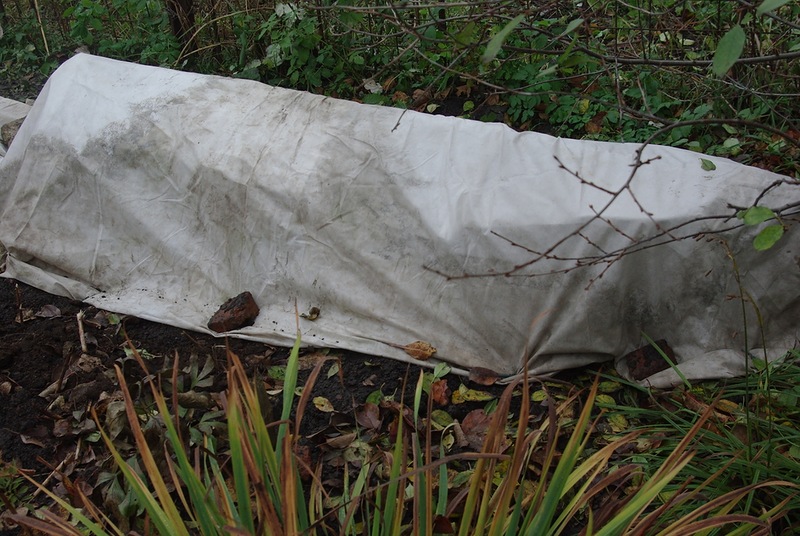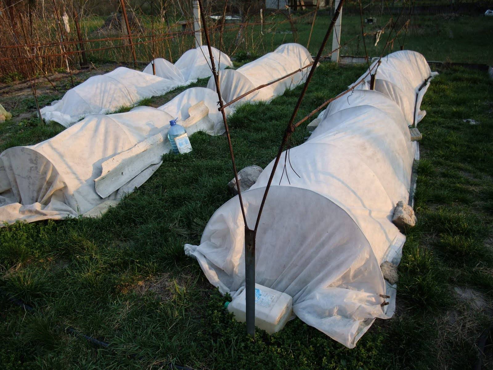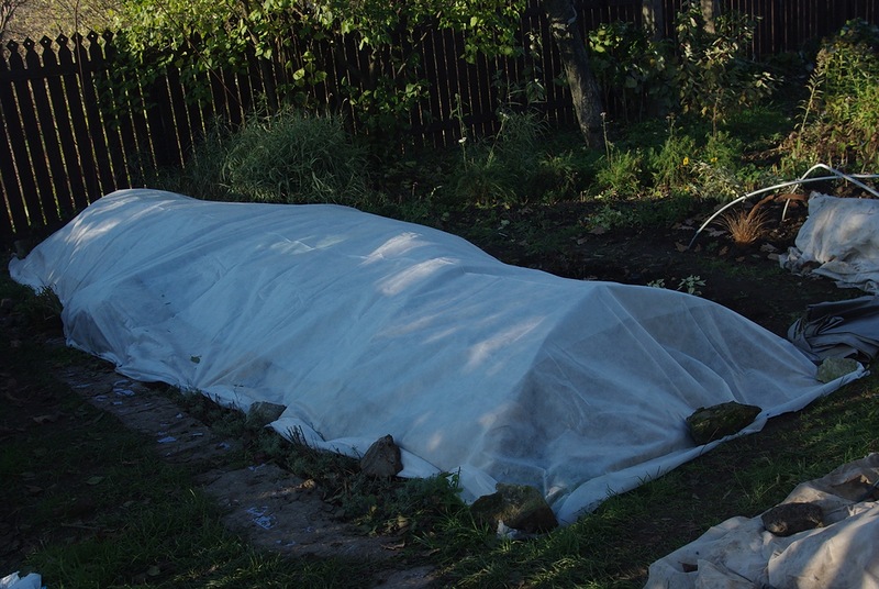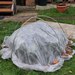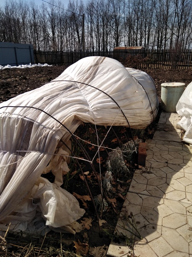 Поверх получившихся тоннелей кладу пергамин (самый дешевый изоляционный материал на строительных рынках) или куски влагозащитной мембраны, оставшиеся от строительства дома (изоспан). Крыша готова. Закрепляю ее на дугах с помощью веревки. Затем всю конструкцию накрываю двойным слоем нетканого материала 60 г/м.кв. (лутрасил, спанбонд, агротекс). Скрепляю короткие куски степлером. Материал закрепляю досками и кирпичами, причем оттягиваю его на себя, чтобы получилась наклонная стенка, которая “поймает” даже 2 см снега. Получилось воздушно-сухое укрытие с дышащими боковинами.