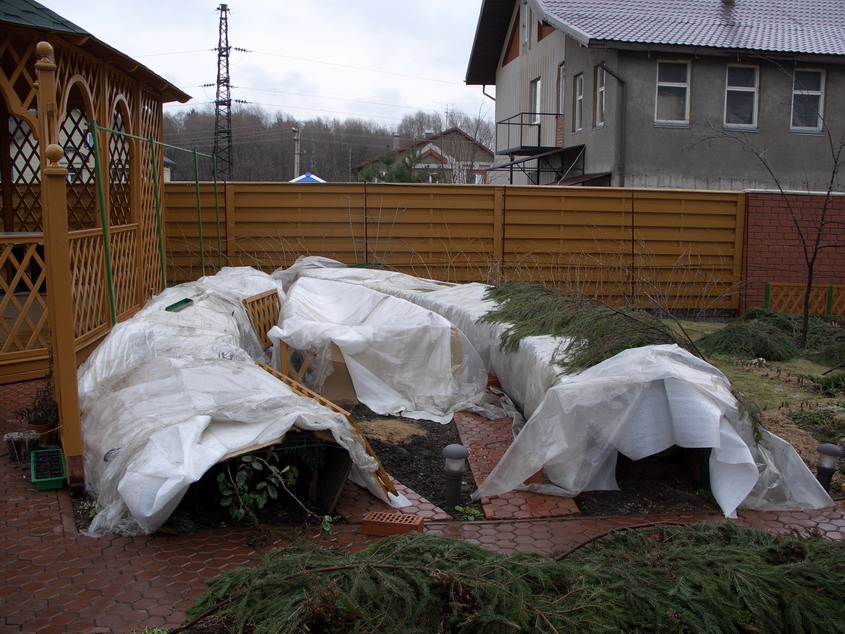 Над кустами организуют укрытие. Если это отдельно стоящие кусты, которые подверглись короткой обрезки, то удобно использовать для укрытия деревянные или пластиковые ящики, которые сверху накрывают полиэтиленовой пленкой, зафиксировав ее кирпичами или прибив рейками, чтобы порывы ветра не сорвали укрывной материал.