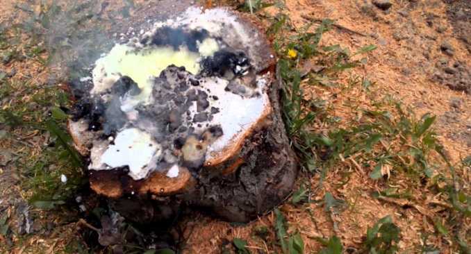 Способ пропитывания и количество реагентов вы найдете в этой статье. После пропитывания пень поджигают с помощью небольшого количества растопки. Время горения 30–90 минут, после окончания горения нет опасности возгорания, потому что древесина полностью сгорает, не оставляя углей.