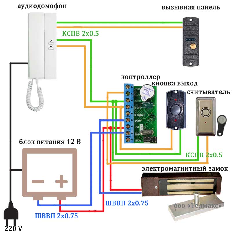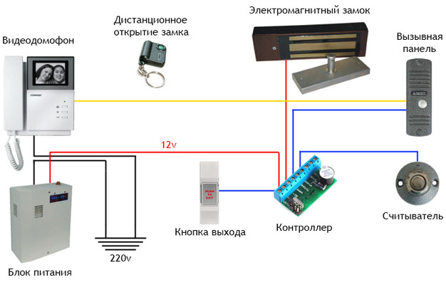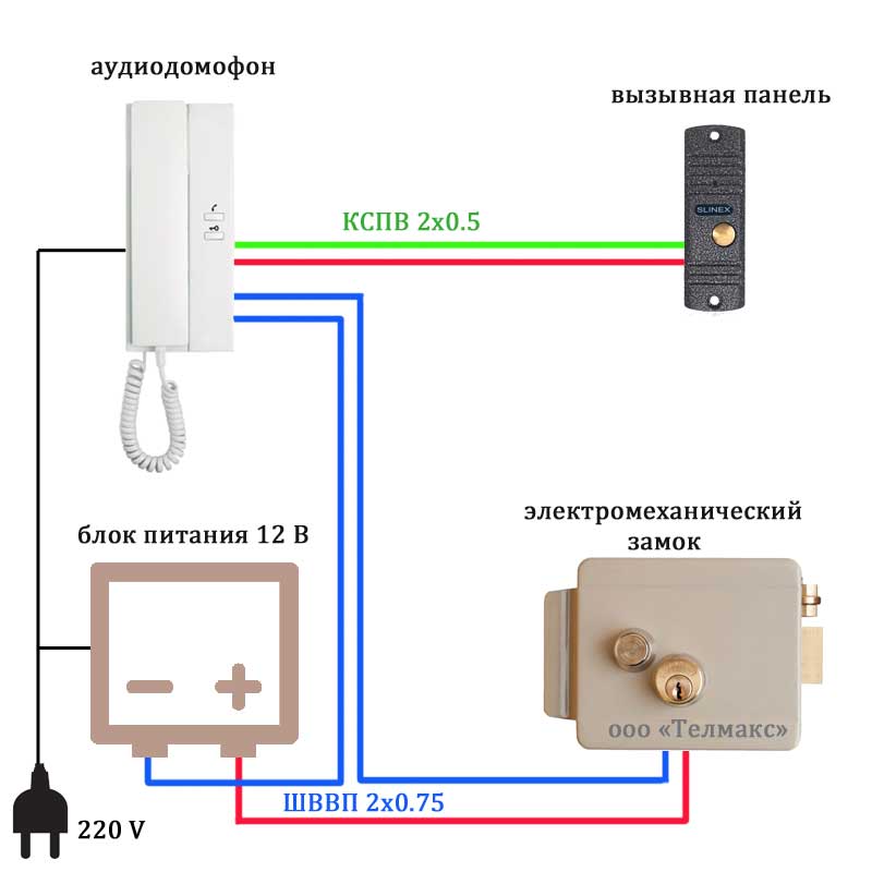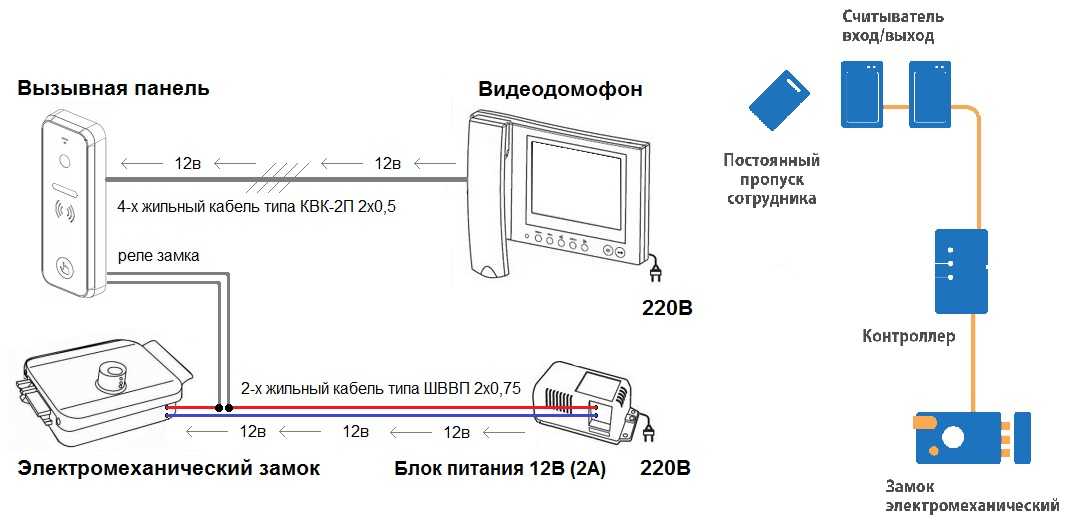 - Самая удобная схема установки — это использование двух разных кабелей. Один кабель будет под электромеханический замок, а другой под видеодомофон.