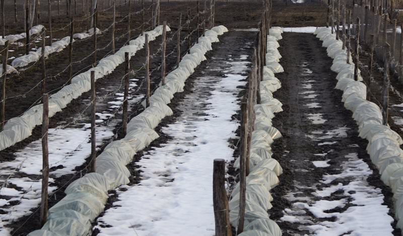 - лозы накрывают пленкой или прочной тканью и прищипывают их землей. Сверху толстый папускар;