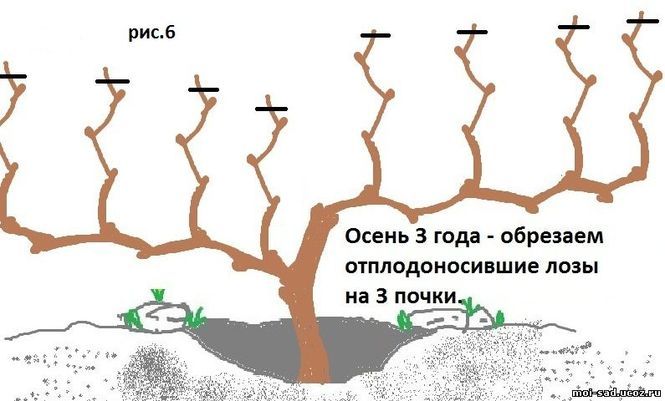 В 3 год на кусте надо сформировать плодовые звенья. Нижняя лоза, которая будет сучком замещения, обрезается на 2 глазка, а верхняя (плодовая) – на 10 почек. Если формируется несколько рукавов, то с ними проделывают то же, оставляя на каждом из них в итоге по 2 лозы. Все остальные побеги с растения необходимо полностью удалить.