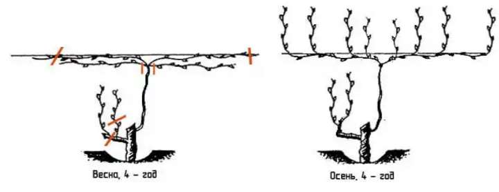 На 4 год формируют рукава, обрезая их в зависимости от того, на какой опоре формируется виноградник, а также удаляется вся ненужная поросль.
