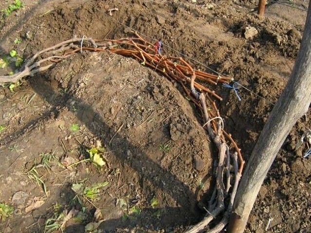 В климатических зонах, где почва за зиму почти не промерзает, также принято делать ямки под виноград, после чего в них помещают кусты и накрывают 10 сантиметровым слоем органического удобрения. А затем все это накрывают 20 сантиметровым слоем земли.