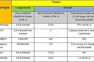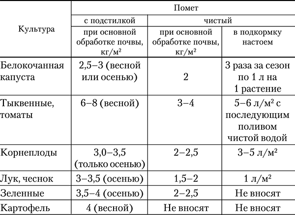 - Осенью вносится до 3 кг/м² с торфом или 2 кг/м² чистого для последующей посадки белокочанной капусты. После высадки капусты подкармливают 2-3 раза куриным пометом по 1 л на кочан.