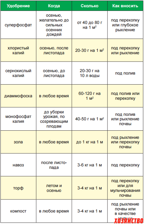 | Все культуры на плодородных землях | под перекопку: рассыпать по земле и перекопать | 40–50 г/м² | осень или весна |
