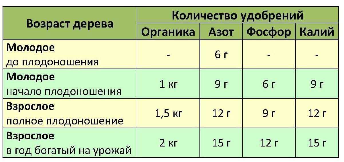 | подкормка вносится в приствольный круг или канавку глубиной 20–30 см по периферии кроны | 40–60 г на каждый квадратный метр приствольного круга | после цветения |