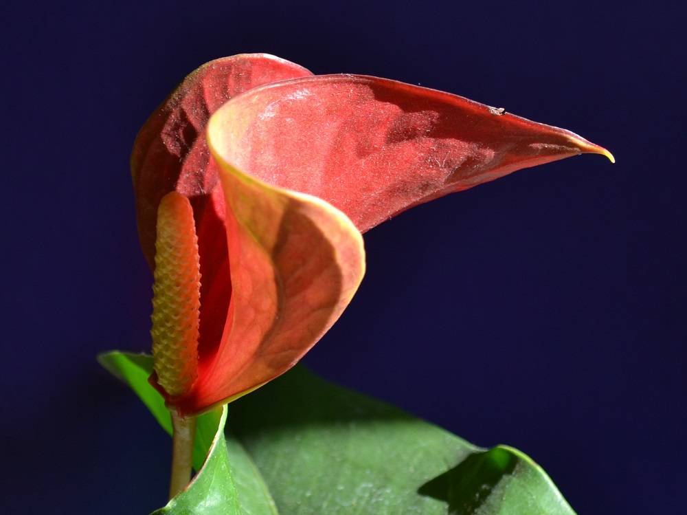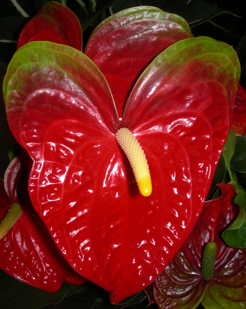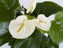 Соцветие антуриума – початок, окруженный ярко окрашенным плотным покрывалом. Цвет от белого до красного, иногда даже двуцветный или переходить из одного в другой, но чаще всего желтый, оранжевый. У цветов слабый приятный запах. С весны до начала осени на одном растении появляются друг за другом цветки, которые сохраняют красоту месяц и больше. Растение должно стоять рядом с окнами, выходящими на запад или восток