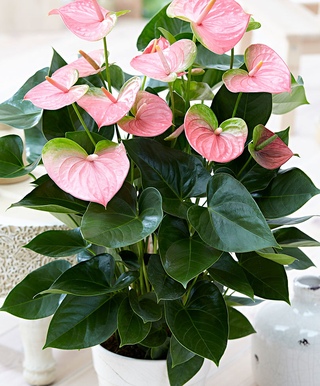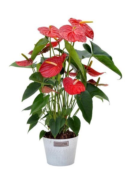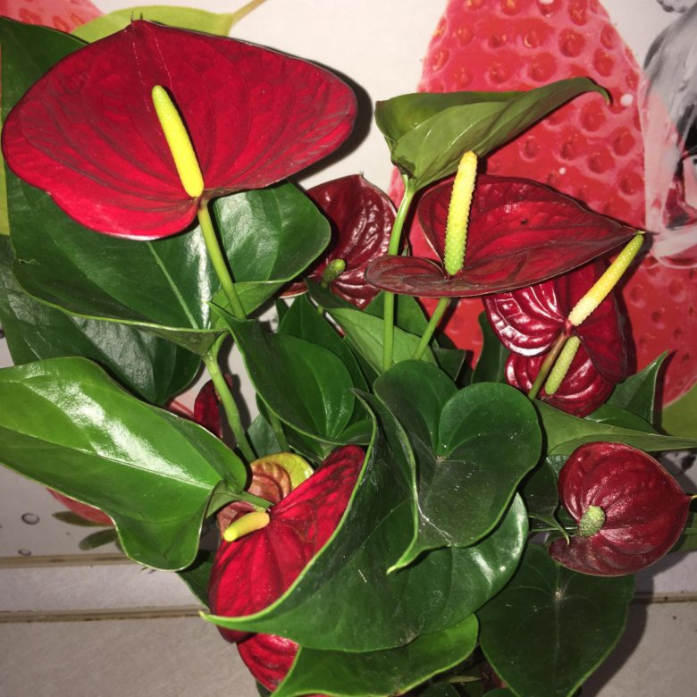Это простое в уходе декоративное растение, также известное как лилия фламинго или «Палитра художника», имеет привлекательную глянцевую темно-зеленую листву с большими мясистыми листьями в форме стрелы и ярко-красными или розовыми покрытыми покровом цветками.