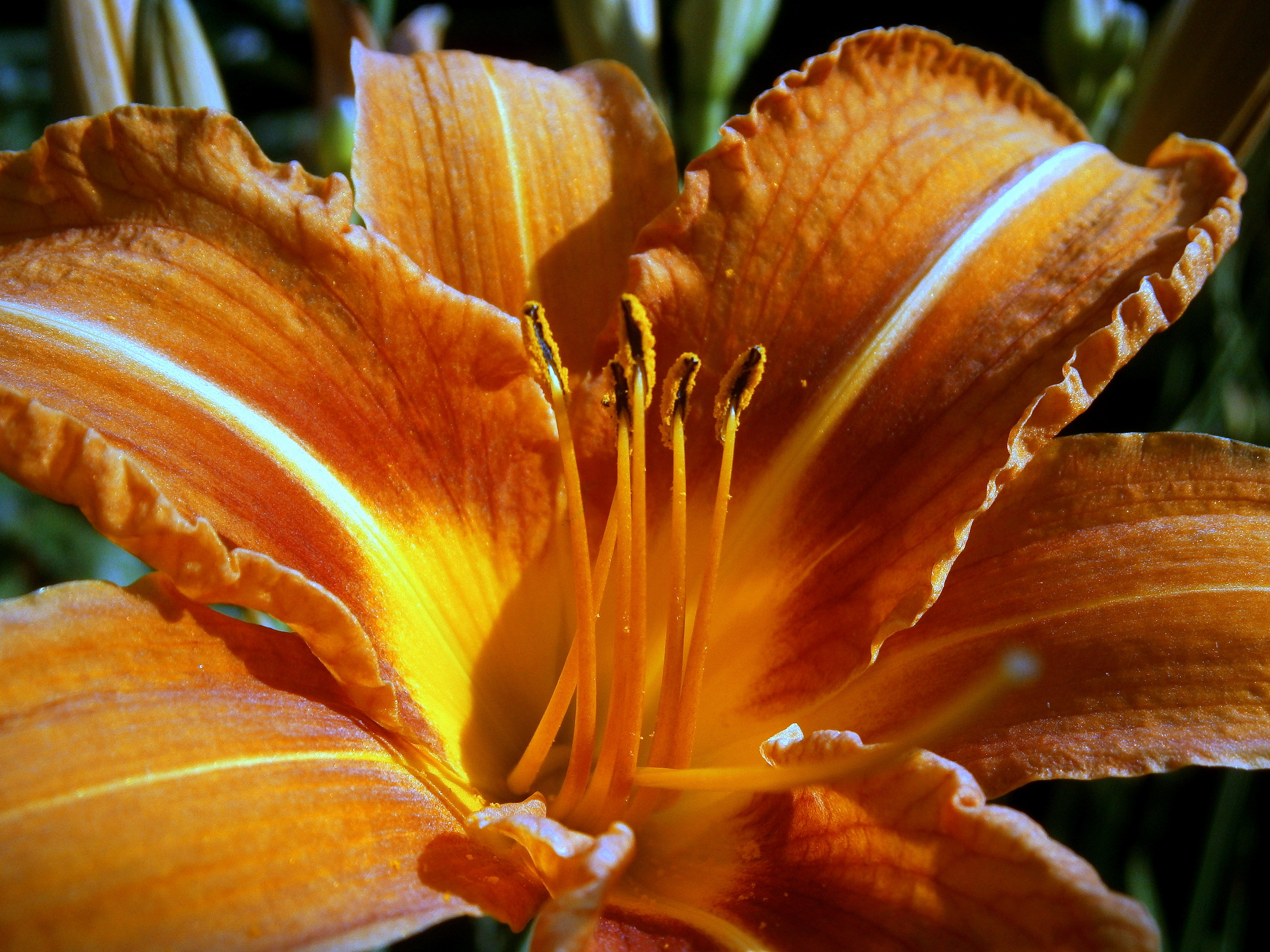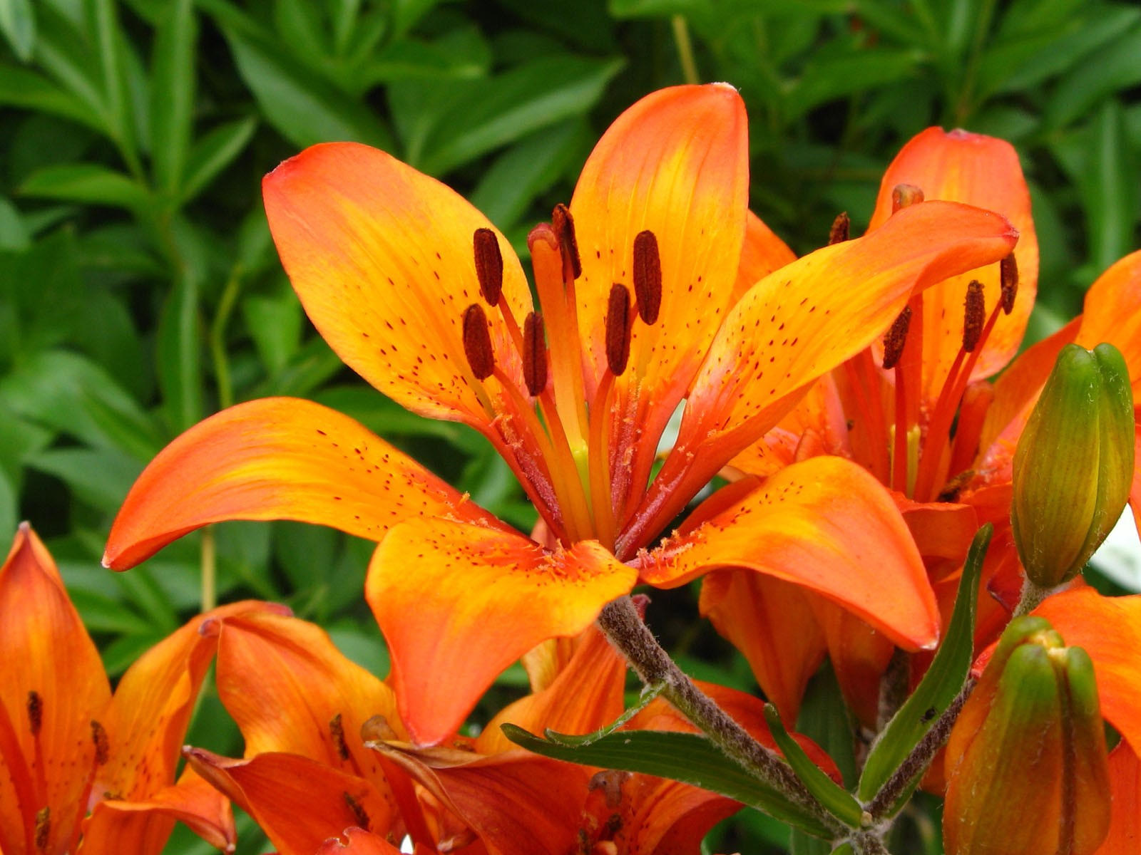 Тигровая лилия(Lilium tigrinum) из Китая с ярко оранжевыми цветками, пурпурно черными пятнами и выступающими тычинками. Они цветут поздно.
