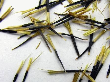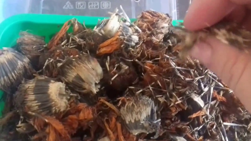 Удалите со стебля головки высушенных цветков календулы, придерживая за основу, снимая и выбрасывая засохшие лепестки и листья. Вы увидите длинные заостренные семена, прикрепленные к основе, темные на одном конце и светлые на другом. Снимите их и выбросьте основу.