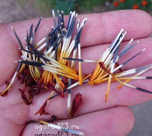 Семена бархатцев приобретаются только для первой посадки, поскольку в конце цветения вы легко получите семена из своих отцветших бархатцев. Нужно только дать нескольким соцветиям хорошо высохнуть прямо на кусте и, если не будет дождя, вы сможете легко извлечь из чашечки созревшие семена, высушить их и сохранить до весеннего посева. Только помните, что почти все существующие в культуре бархатцы – гибриды, а это означает, что каждый четвертый сеянец не сохраняет сортовые свойства и может унаследовать либо отцовские, либо материнские признаки.