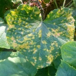 Угловые поражения, ограниченные жилками, на нижней стороне мускатной тыквы.