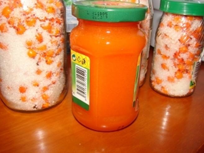 - Промытые ягоды смешать с сахаром и пропустить через мясорубку. На один килограмм облепихи потребуется 0,7 кг сладкого песка. Ягоды следует поместить в стерилизованные банки, плотно их закрыть и хранить в прохладном помещении.
