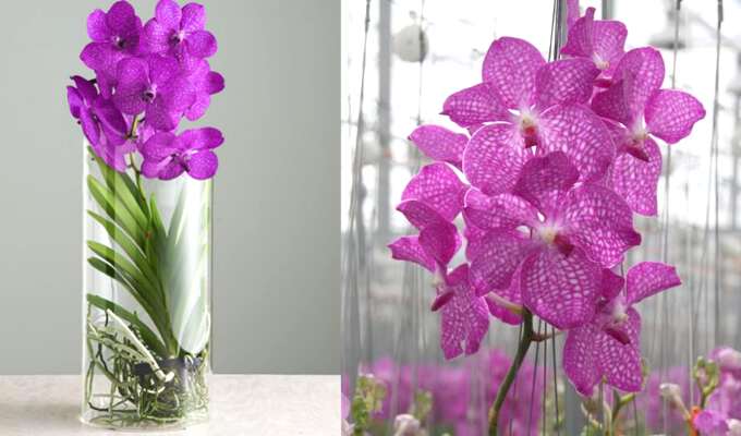 Орхидеи рода Vanda (этот род насчитывает более 70 видов и является частью семейства Orchidaceae) родом из тропической Азии. Монопод, они напоминают фаленопсис, особенно в отношении цветов: крупные, ярко окрашенные и широко открытые, отклоненные в соответствии с сортами в широком спектре роз, пурпурных, апельсинов и даже синих.