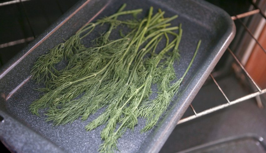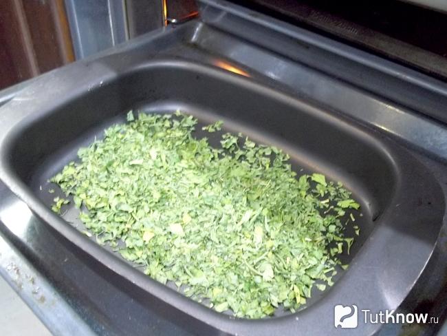 Для этого ее разогревают до температуры 45 – 50 градусов. Зелень или коренья помещают в духовку, и сушат при открытой дверце порядка 5 – 6 часов.