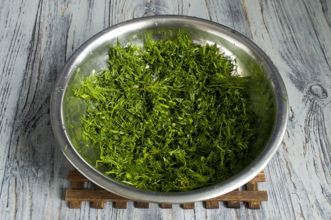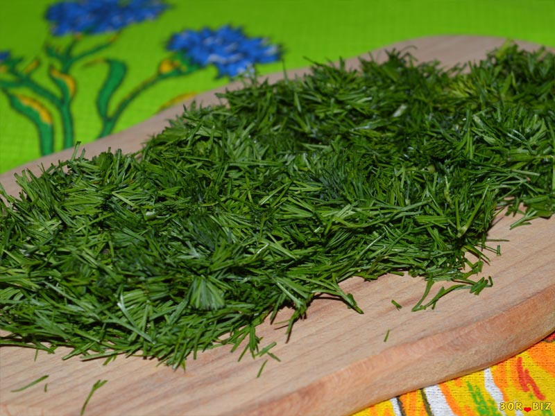 - Расстелите на них зелень тонким слоем.