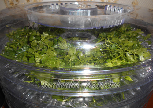 Время сушения зависит от влажности окружающего воздуха, вида пряности и размера ее нарезки. Чтобы продукты просыхали более равномерно, лотки с петрушкой нужно менять местами каждые 1,5 часа.