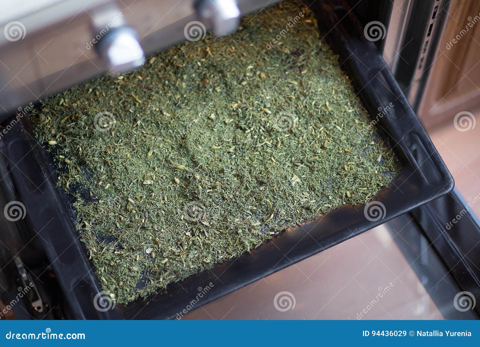 Зеленую нарезку располагают на плоских тарелках или поддонах, слоем не более 1 сантиметра, и выставляют в хорошо вентилируемое помещение. Чтобы в зелени сохранился хлорофилл, и она не пожелтела, сушку следует оберегать от попадания прямого солнечного света. Равномерной дегидратации также способствует периодическое перемешивание нарезки.