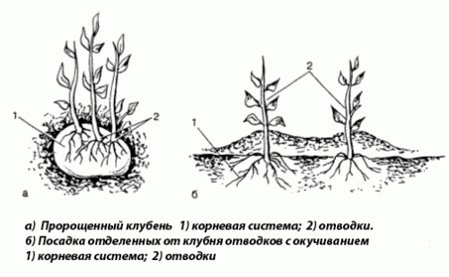 Если все-таки образовались длинные ростки, такие клубни осторожно извлекают из ящика, не обрывая ростков, высаживаются в лунку и присыпаются землей. Следует помнить, что наиболее жизнеустойчивы первые ростки.
