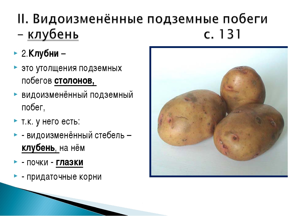 Клубень картофеля является укороченным утолщенным стеблем, о чем свидетельствуют многочисленные сходства, особенно заметные на ранней стадии развития. Это, в частности, наличие чешуйчатых листочков, в пазухах которых формируются покоящиеся почки, количество которых варьируется от 2 до 4 в каждом глазке.