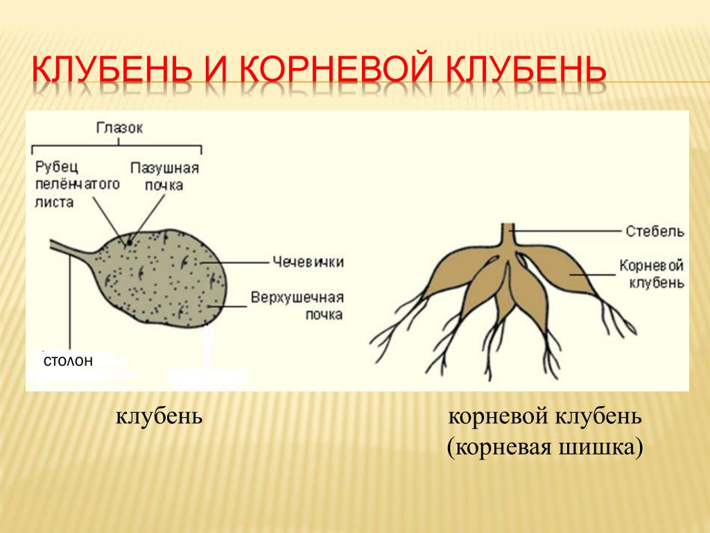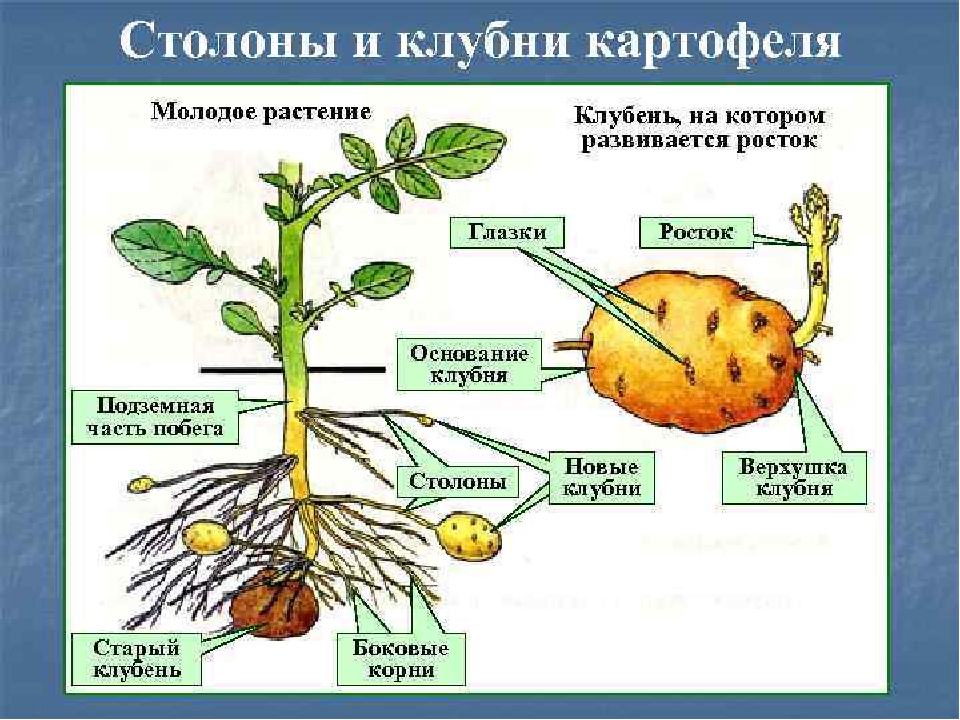 Клубень картофеля – побег, но не надземный, а подземный. Его формирование происходит следующим образом. Ввиду повышенной концентрации питательных веществ в верхней части клубня, при посадке наблюдается прорастание почек не всех глазков, а только тех, что располагаются в верхней его части. Цвет ростков зависит от сорта и может быть зеленым, красно-фиолетовым или сине-фиолетовым. Когда растение достигает высоты 10-20 см, то подземная часть его стеблей дает побеги — столоны, толщина и длина которых составляют 2-3 мм и 5-15 см соответственно. Их концы постепенно утолщаются, превращаясь таким образом в клубни.