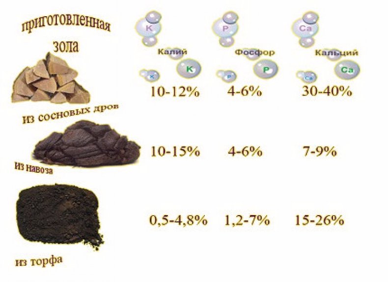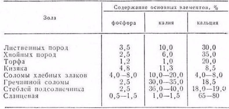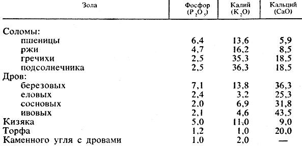 Самая высококалийная зола у стеблей подсолнечника и гречихи, после них идёт древесная зола. Она же содержит много кальция, который при избытке не даёт усваиваться соединениям железа и приводит к хлорозу листьев.