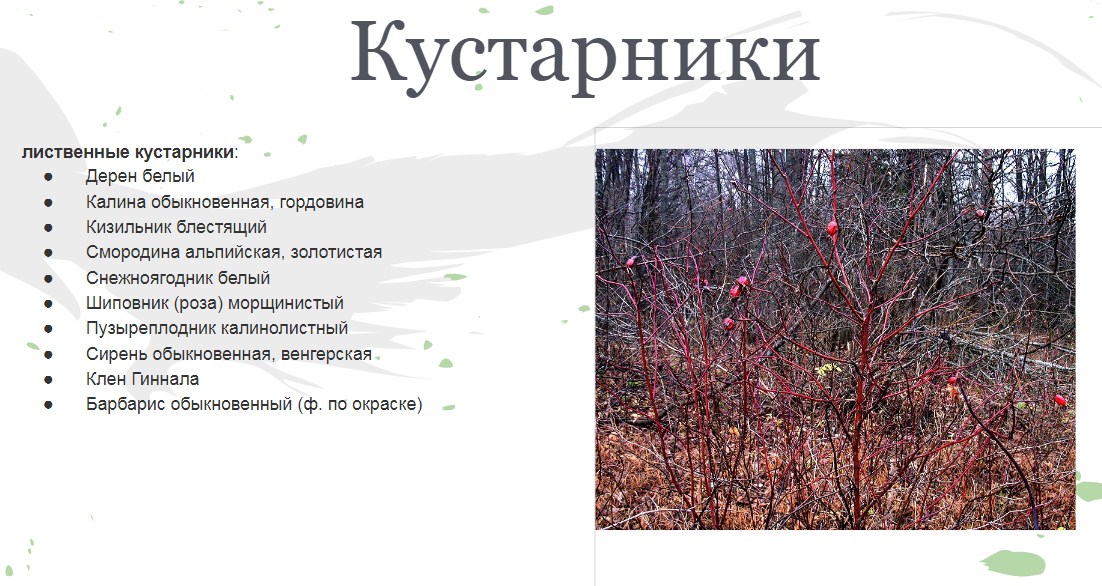 Башкирия, к примеру, регион довольно прохладный, для Башкирии свойственны зимостойкие кустарники вроде рябины, шиповника, вечнозелёных растений.
