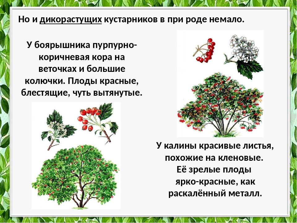 Декоративное растение с полезными ярко-красными ягодами. Цветёт в конце весны красивыми белыми цветами. Гроздья ягод созревают ближе к осени. Куст довольно морозостойкий. Калина хорошо растёт как в тени, так и на солнце. Требует хорошего стабильного полива. - Шиповник. Колючий кустарник, являющийся дикорастущей розой. Плоды очень полезны, ведь он насыщены витамином C. Можно использовать в качестве живой изгороди. По декоративности шиповник не уступает розе. Не требует особого ухода, спокойно переносит холодное время года.