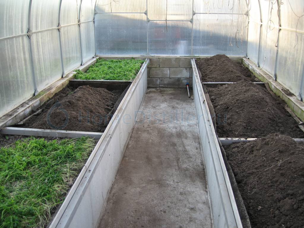 Высокие грядки в теплице делают осенью, так же, как и на улице. Верхний слой грунта снимают, отодвигают в сторону, а получившуюся канаву заполняют свежим навозом, растительными остатками, перегноем. Сверху снова укладывают грунт.