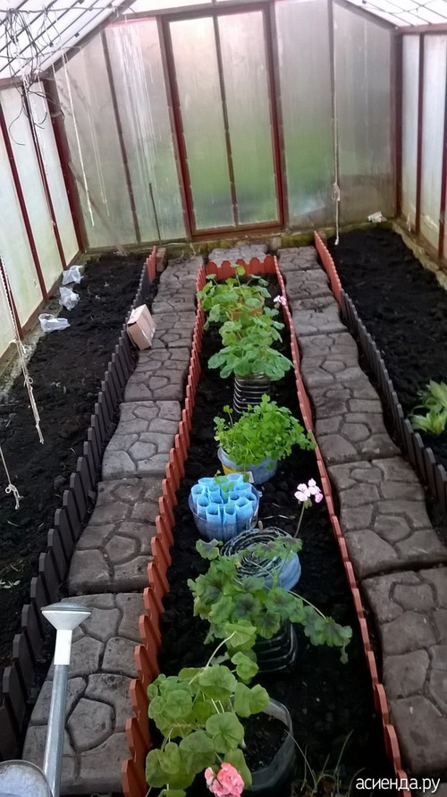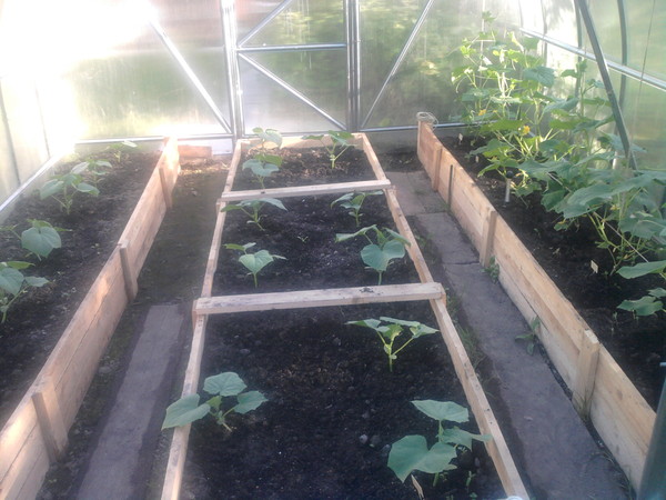 - три узкие гряды вдоль теплицы с двумя средними междурядьями;