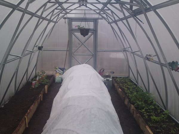 - одна П-образная гряда вдоль стен теплицы и одна узкая гряда в ее центре.