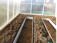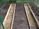 - Насыпьте в гряды недостающий слой грунта или сформируйте теплые гряды с помощью растительных остатков так, чтобы высота грядок в теплице была не менее 20 см.