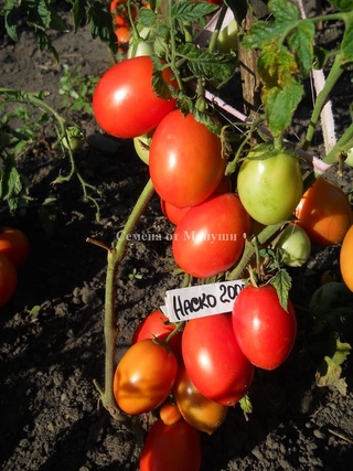 Индетерминантный куст, междоузлия короткие. Соцветие по описанию образуется над 9 листом, следующие – через 3 листа. Плоды округлые, слаборебристые, красные, весом до170 г. Кисти не заламываются. Вкус отличный для гибридных плодов.