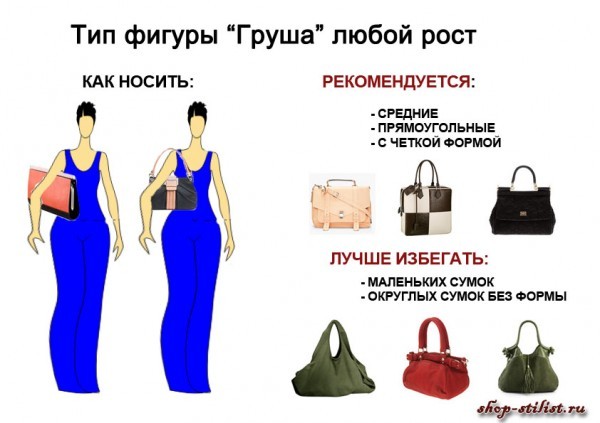 Желательно, чтобы выбранная женщиной с фигурой «груша» сумка не свисала на уровне самой широкой линии бедер. Пусть сумка висит либо выше самой широкой линии бедер, либо ниже ее. Можно также носить среднего размера сумку в руке. Если у вас полные ноги, ваши брюки должны быть подобраны так, чтобы они не облегали ногу, но, в то же время, не были слишком объемными и очень широкими.