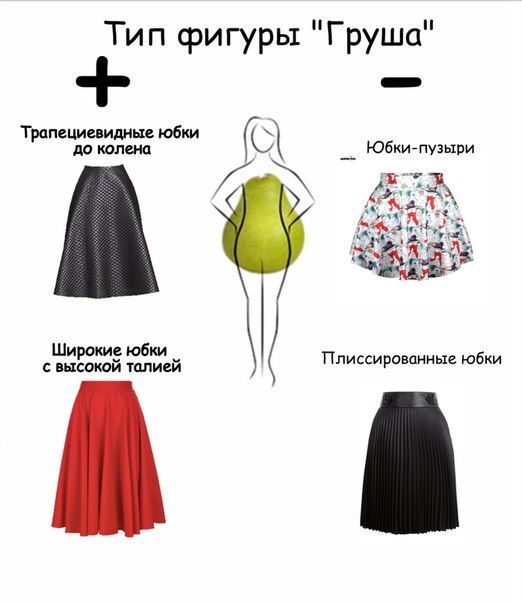 Правильно подобранная юбка скорректирует силуэт и подчеркнёт женственные особенности груш. В числе самых подходящих силуэтов: полусолнце, трапеция, тюльпан. Юбка со складками и элегантным поясом продемонстрирует тонкую талию.