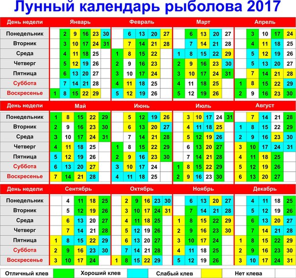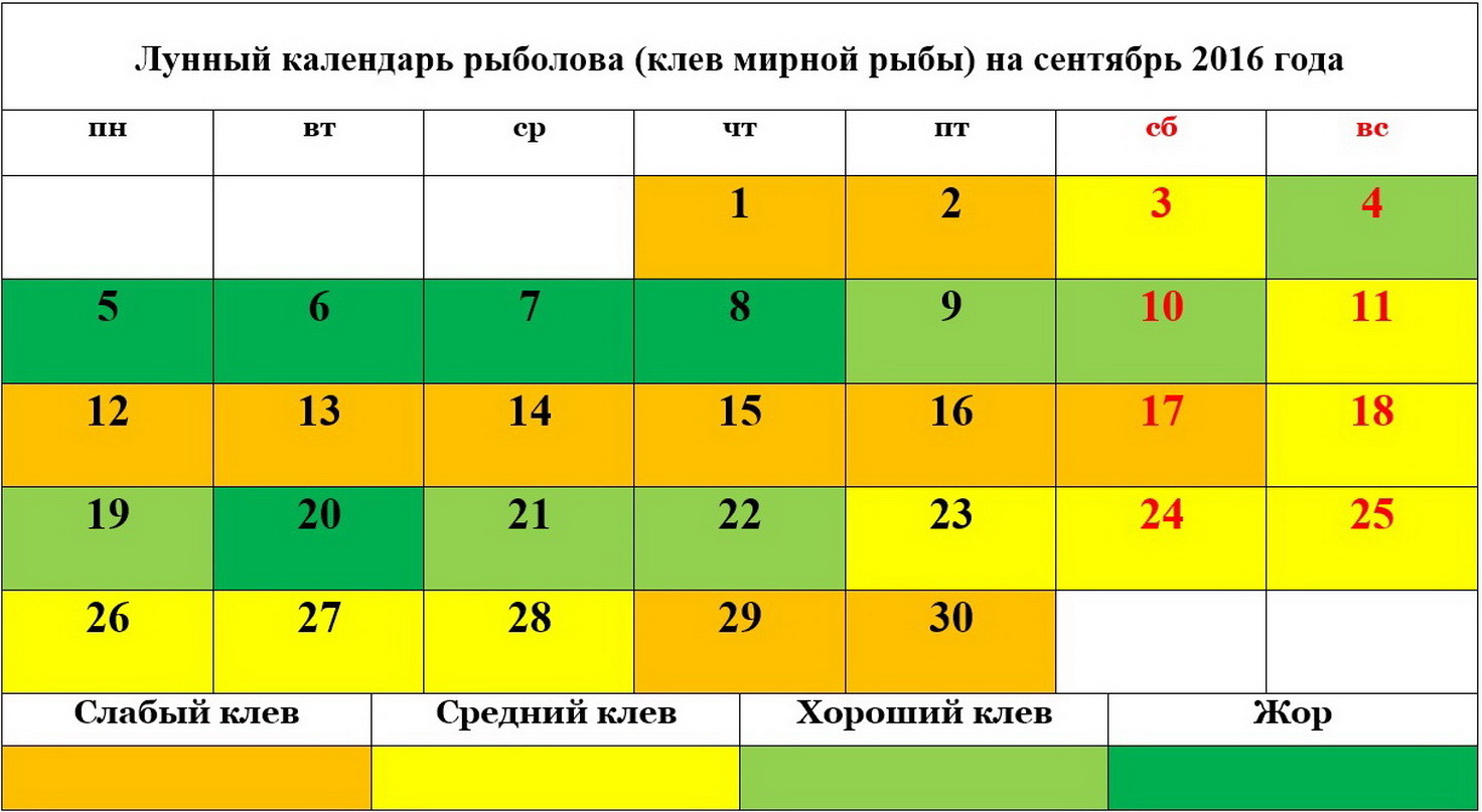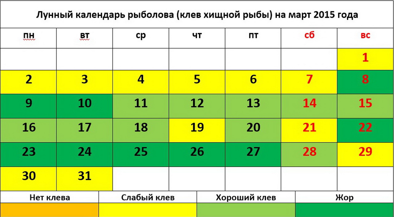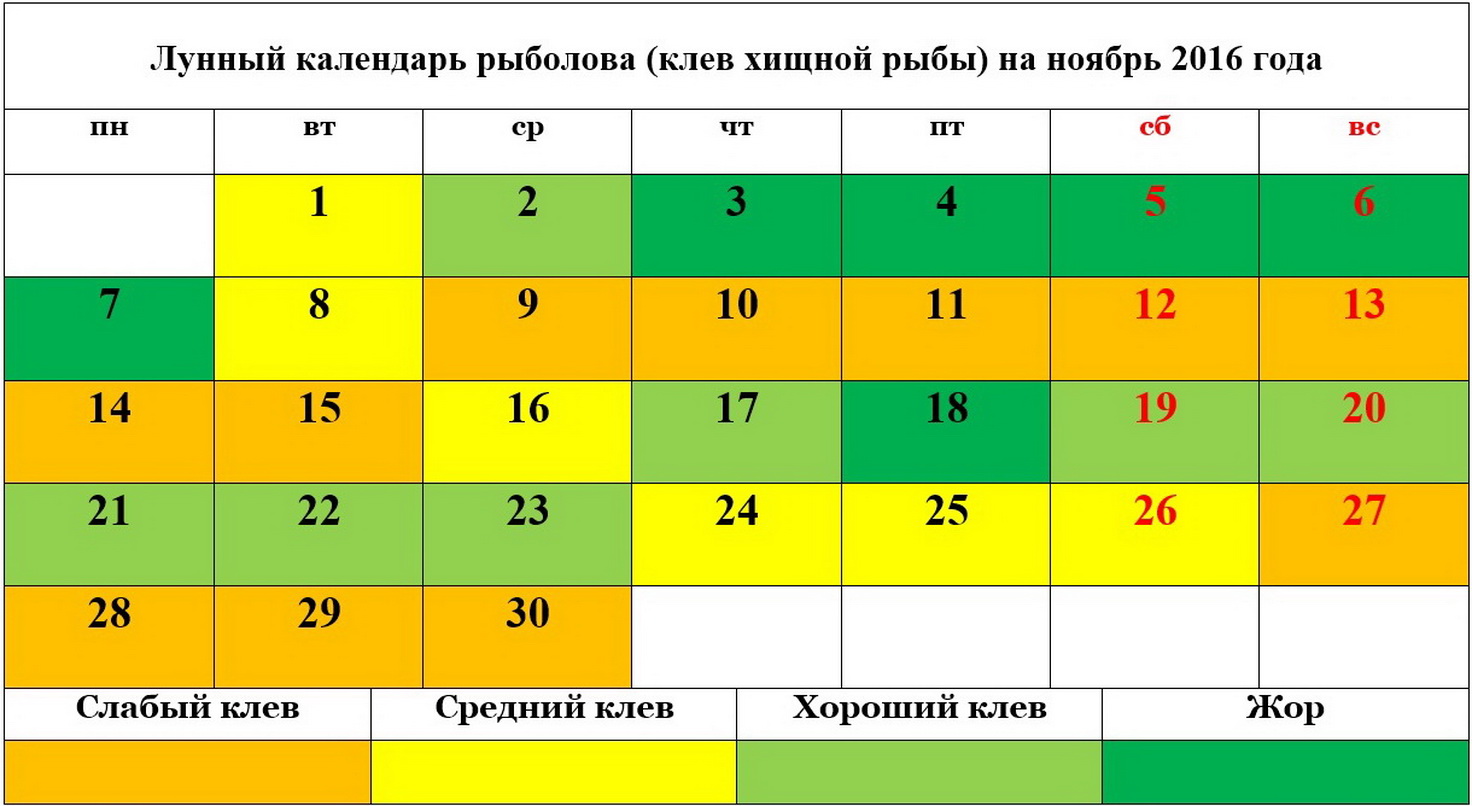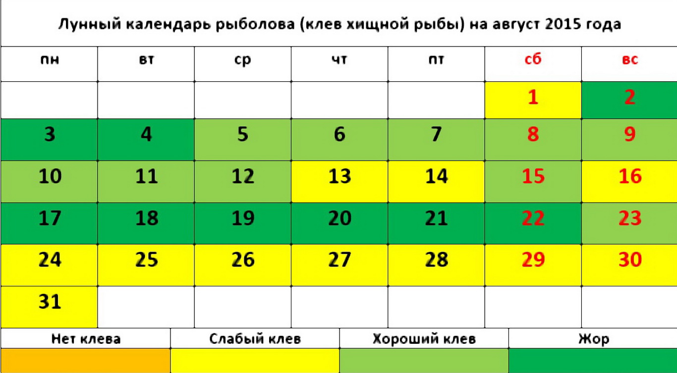 Плохой клев рыбы: с 11 по 15, с 27 по 31.