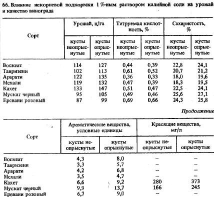 Передовики многих виноградарских районов добиваются высоких урожаев, внося большие дозы удобрений на фоне очень высокой агротехники: органических удобрений до 40 т на гектар в первый год, а в последующие — азотных удобрений до 3 ц/га, фосфорных — до 6 ц/га и калийных — до 3,0 ц/га ежегодно.