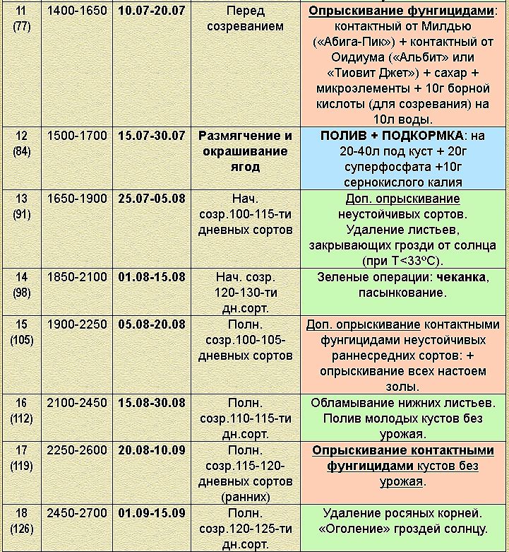 Внесение удобрений необходимо сообразовывать и с наступлением осеннего изменения окраски листьев, а именно: 1) при преждевременном пожелтении листьев и замедлении роста вносят преимущественно удобрения с преобладанием азота; 2) при запоздании осеннего пожелтения листьев вносят удобрения с меньшим количеством азота и с преобладанием калия и фосфора; 3) при преждевременном осеннем листопаде, вследствие перегрузки кустов виноградом, вносят увеличенные дозы удобрений, преимущественно азотных.