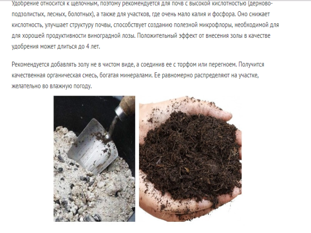Основные виды удобрения для винограда при посадке: органические — компост , навоз; минеральные— калийная соль, суперфосфат ; широко используют в качестве удобрения для винограда древесную золу. Удобрения вносят на дно траншеи. Важно в первые месяцы после высадки виноградника обогатить элементами питания слой почвы, в котором в дальнейшем будет развиваться корневая система саженца .