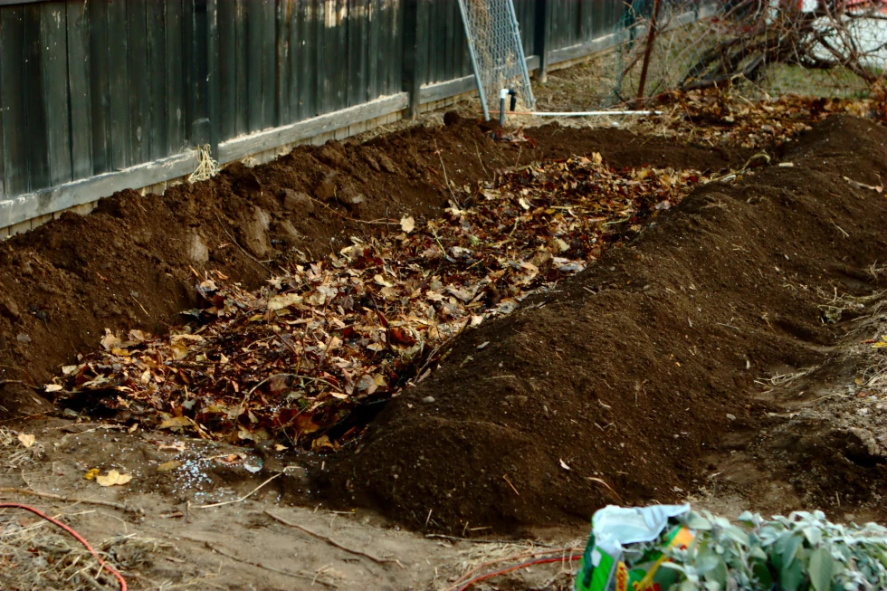 Навоз вносят в траншею глубиной 50 см и шириной около 80 см. Ее нужно выкопать с одной