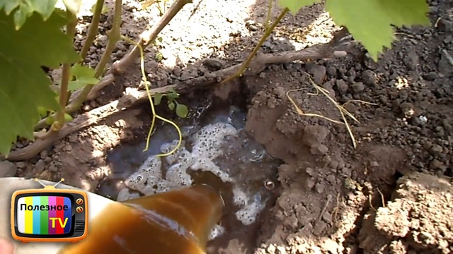 Испробована была также и другая дозировка удобрения, а именно: удобрения из расчета 150 кг азота, 230 кг К2О и 300 кг Р2О5 растворяют в стольких литрах воды, сколько на гектаре виноградника кустов. Вокруг каждого куста делают ломом по 5 углублений и вносят в них по 200 см3 раствора указанным выше способом.