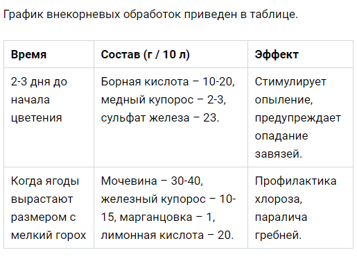 При достаточных количествах воды на участке целесообразно проведение подкормок перед цветением, после цветения и перед созреванием. При первой подкормке до цветения вносят азотное, фосфорное и калийное удобрения, при последующих — только фосфорное и калийное.