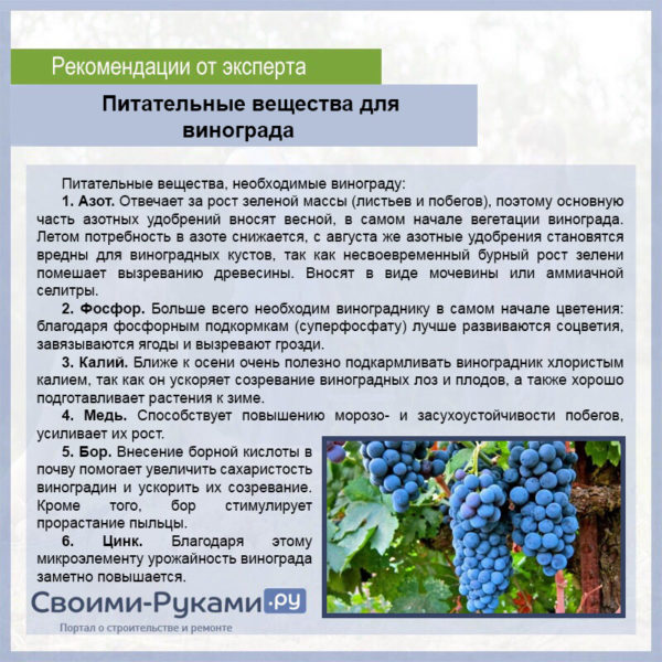 Ежегодно плодоносящий виноградный куст выносит из почвы доступные элементы питания – азот и калий