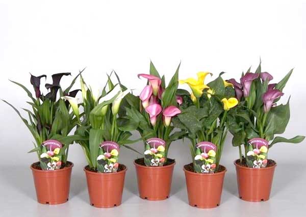Невероятно красивы цветные сорта каллы в горшках. Уход в домашних условиях предполагает их размножение клубнями, которые закапывают на глубину от 6 до 12 см в зависимости от величины. Для поддержания необходимого уровня влажности и тепла горшок накрывают прозрачной пленкой.