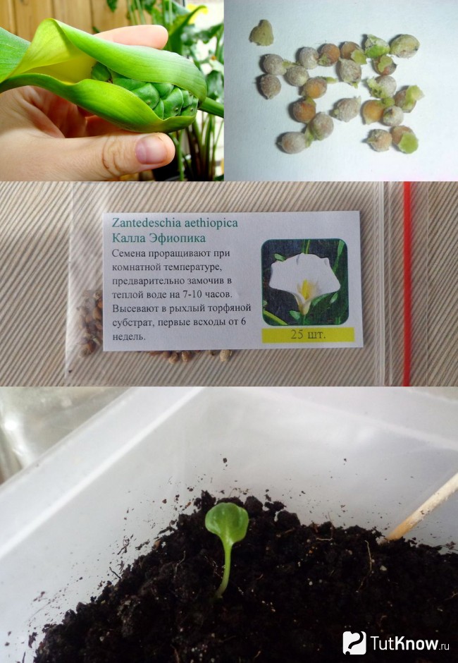 Помимо размножения луковицами, каллы могут размножаться с использованием семян. Семена можно приобрести в магазине. Экономичнее дождаться, когда стручки семян созреют у знакомых. Из семян период прорастания довольно длительный и требует тщательного контроля температурного режима.