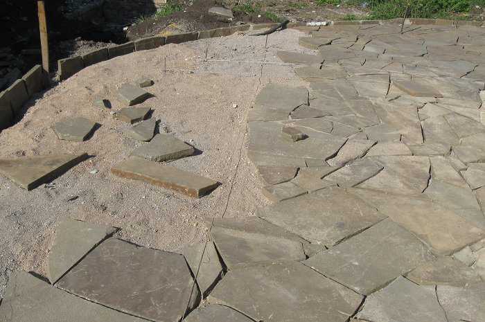 Этот центральный образец следует обозначить мелом, подписав цифрой “1”. Затем подберите кусок плитняка, который наилучшим образом подойдет по контуру к первой плитке. Они должны смыкаться с минимальным зазором.